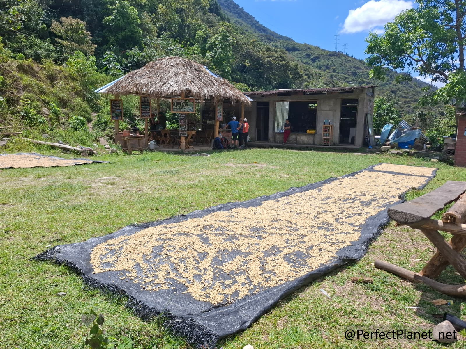 Un par de horas más tarde llegamos a la zona conocida como la Playa donde hay varios restaurantes. Delante de las casas tienen secando granos de café.